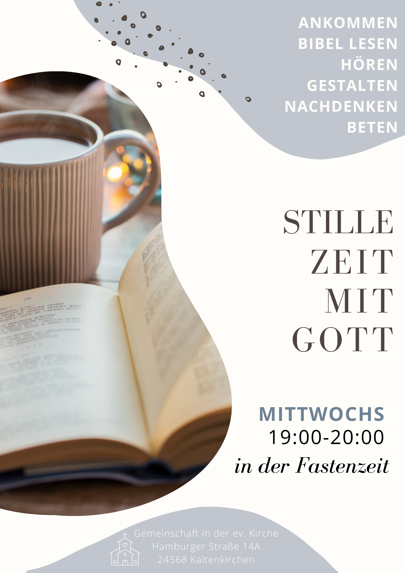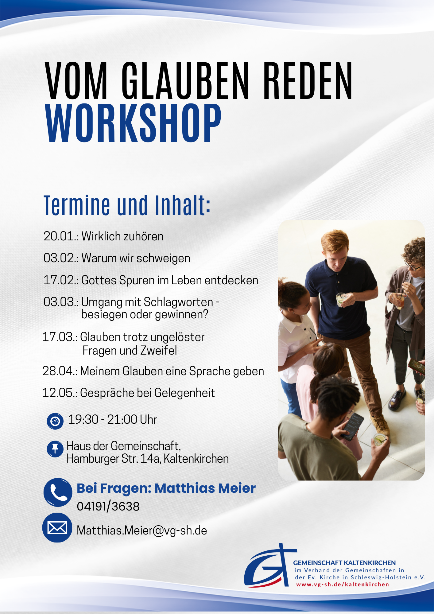 Im angehängten Flyer findet Ihr die Termine und Themenstellungen für die Dienstagabende, immer von 19:30 bis 21:00 Uhr. Eine Teilnahme ist auch an einzelnen Abenden möglich. Eine Anmeldung ist für uns hilfreich, aber nicht erforderlich.