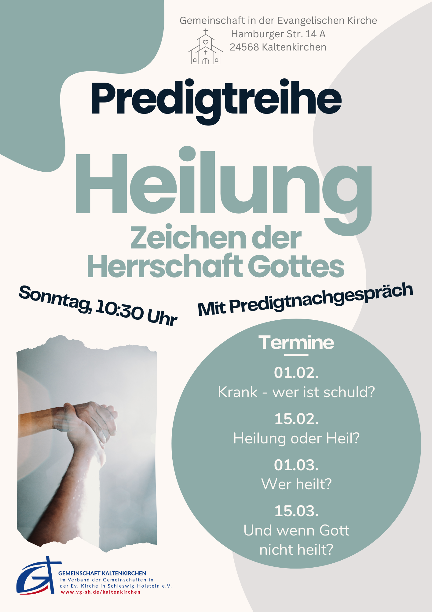 An vier Sonntagen im 14tägigen Rhythmus geben wir Impulse zum Thema „Heilung – Zeichen der Herrschaft Gottes“. Im Anschluss an den Gottesdienst bieten wir jeweils ein Predigtnachgespräch an, in dem wir uns über das Gehörte und auch über dadurch ausgelöste Fragen, Widerspruch und Ideen austauschen können.